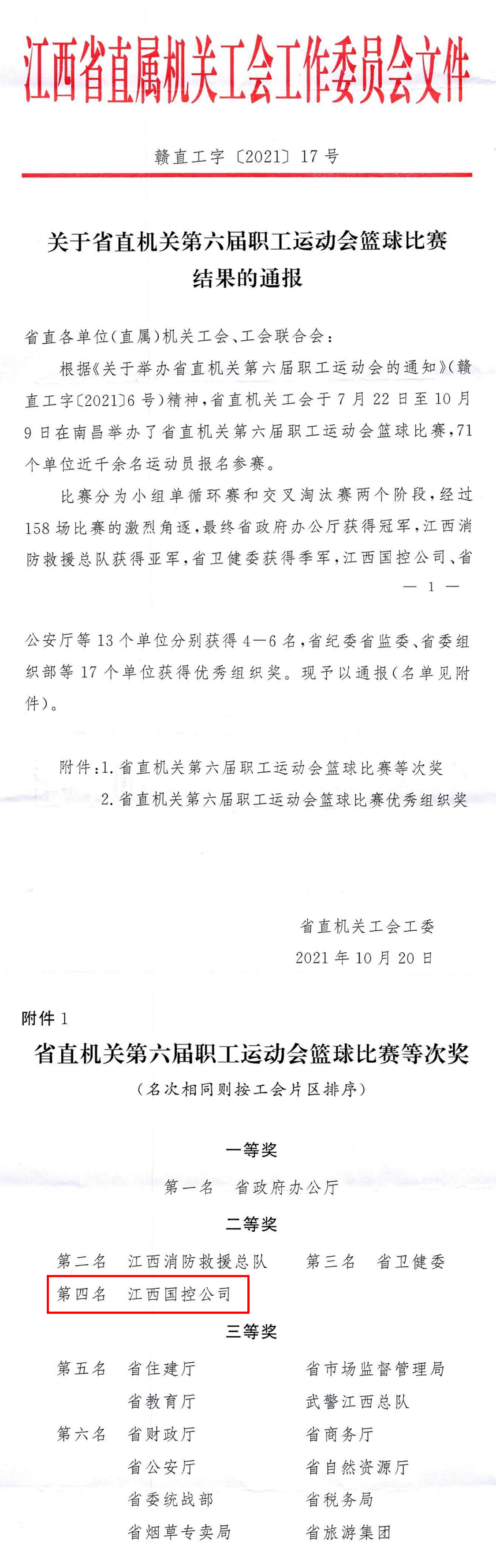 10月9日,省直机关第六届职工运动会篮球比赛圆满落幕,本届比赛历时2个半月、158场比赛,吸引了71支代表队千余名干部职工参加。10月20日,省直机关工会工委印发《关于省直机关第六届职工运动会篮球比赛结果的通报》,公司勇夺本届篮球比赛二等奖、第四名的佳绩。