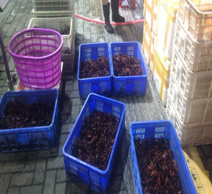 在水产市场,有很多销售小龙虾产品的商户,大家挑选了几家商户进行询价、问价。通过友好沟通,商户传授了许多知识,如市场内小龙虾都是按三、四、五钱等来区分龙虾的重量,相应的价格也有所不同等等。