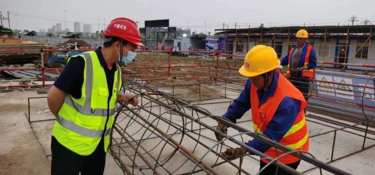 中建国际投资江苏公司安福项目安全经理林孙滔巡查矿坑公园施工现场, 抽查工人三级安全教育、安全技术交底、检查特殊工种持证上岗、焊工是否规范操作、流调防疫问卷填报以及实名制刷脸系统使用情况,推动项目安全有序进行。